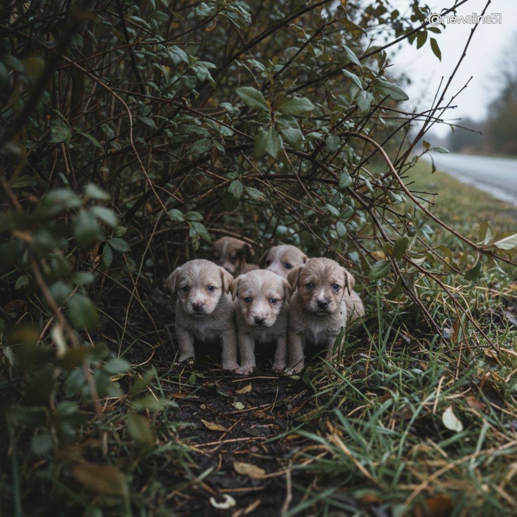 The search began immediately. After an hour of frantic looking, the puppies were found hidden in a nearby bush, four tiny bodies crying weakly from hunger and exposure.