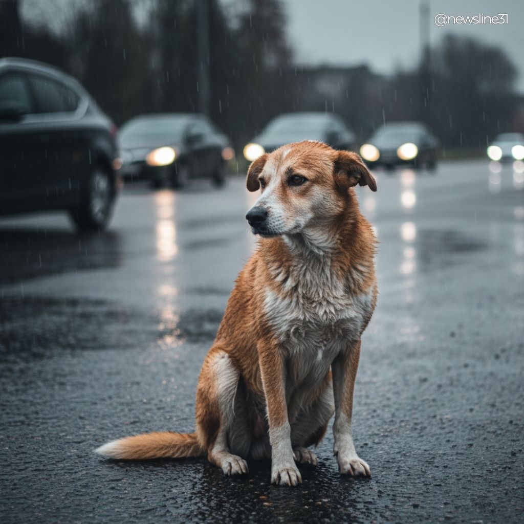 In the cold rain, a soaked mother dog knelt on the roadside, trembling as cars passed without slowing down.