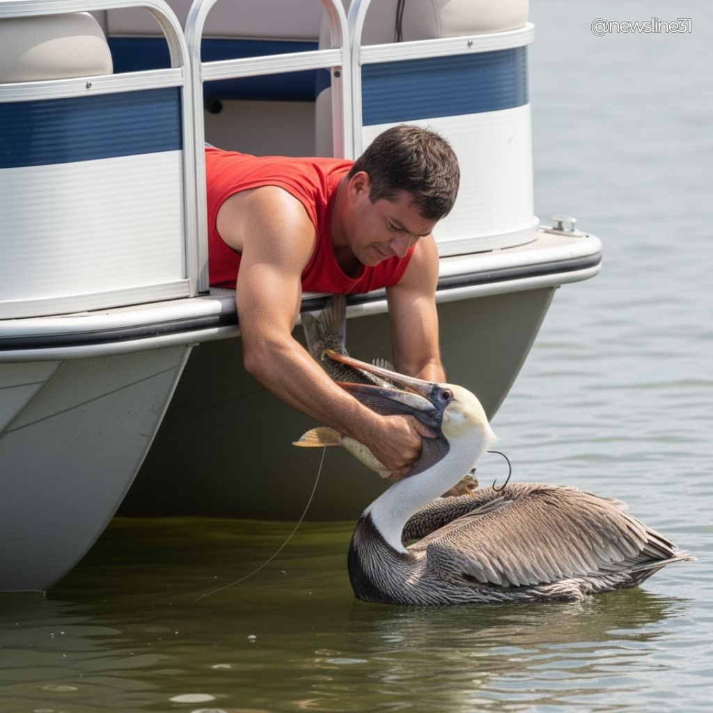 “Let the bird go,” someone said softly, as the pelican floated away, safe and alive. Thanks to quick thinking and compassion, both animals survived.